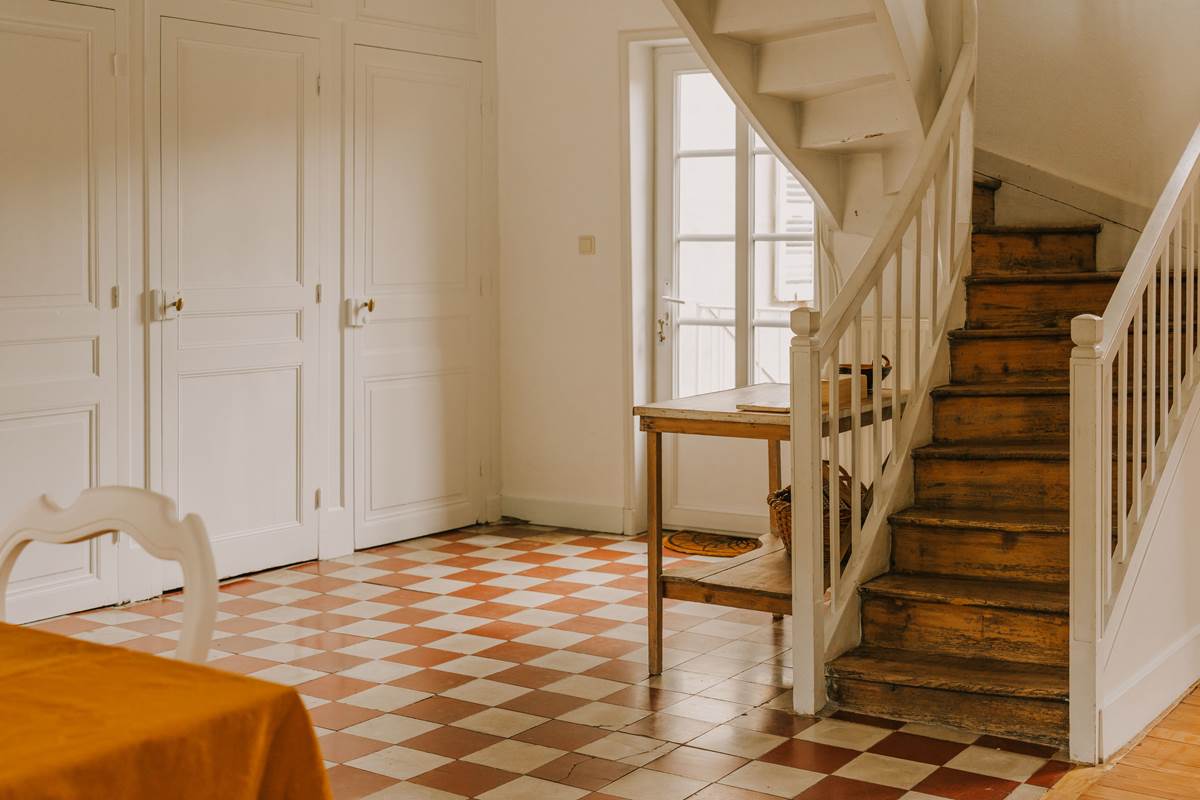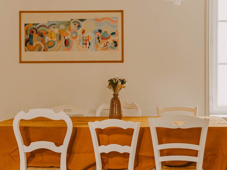 D'une superficie totale d'environ 100 m2 répartis sur deux étages, ce gîte propose un vaste séjour comprenant un coin salon avec une grande bibliothèque, une cheminée, une grande table à manger et une petite cuisine bien équipée. La pièce s'ouvre sur une terrasse privative, la cour, le parc et la piscine.